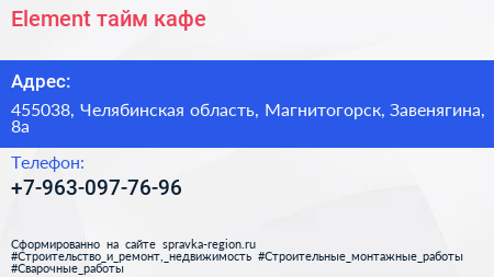 Element, тайм-кафе по адресу 455038, Челябинская область, Магнитогорск, Завенягина, 8а в дальнейшем Организация, размещена в следующих категориях: