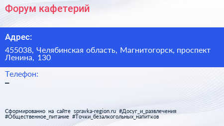 Форум, кафетерий по адресу 455038, Челябинская область, Магнитогорск, проспект Ленина, 130 в дальнейшем Организация, размещена в следующих категориях: