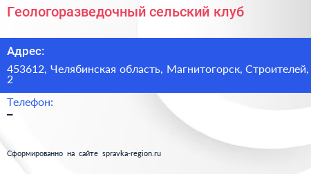 Геологоразведочный сельский клуб по адресу 453612, Челябинская область, Магнитогорск, Строителей, 2 в дальнейшем Организация, размещена в следующих категориях: