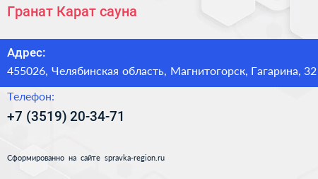Гранат Карат, сауна по адресу 455026, Челябинская область, Магнитогорск, Гагарина, 32 в дальнейшем Организация, размещена в следующих категориях: