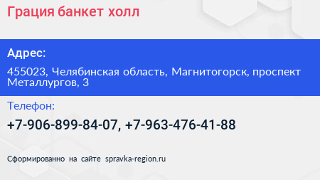 Грация, банкет-холл по адресу 455023, Челябинская область, Магнитогорск, проспект Металлургов, 3 в дальнейшем Организация, размещена в следующих категориях: