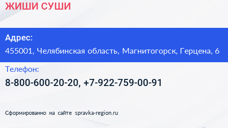ЖИШИ СУШИ по адресу 455001, Челябинская область, Магнитогорск, Герцена, 6 в дальнейшем Организация, размещена в следующих категориях: