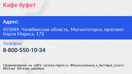 Кафе-буфет по адресу 455049, Челябинская область, Магнитогорск, проспект Карла Маркса, 172 в дальнейшем Организация, размещена в следующих категориях: