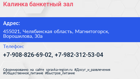 Калинка, банкетный зал по адресу 455021, Челябинская область, Магнитогорск, Ворошилова, 30а в дальнейшем Организация, размещена в следующих категориях:
