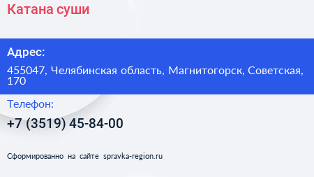 Катана-суши по адресу 455047, Челябинская область, Магнитогорск, Советская, 170 в дальнейшем Организация, размещена в следующих категориях:
