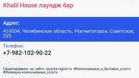 Khalil House, лаундж-бар по адресу 455034, Челябинская область, Магнитогорск, Советская, 225 в дальнейшем Организация, размещена в следующих категориях: