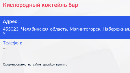 Кислородный коктейль-бар по адресу 455023, Челябинская область, Магнитогорск, Набережная, 9 в дальнейшем Организация, размещена в следующих категориях: