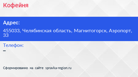 Кофейня по адресу 455033, Челябинская область, Магнитогорск, Аэропорт, 33 в дальнейшем Организация, размещена в следующих категориях: