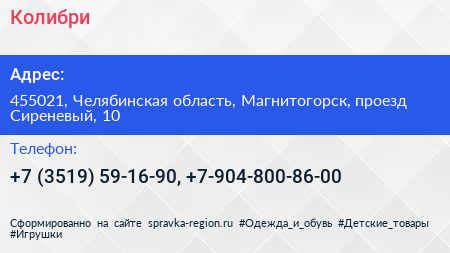 Колибри по адресу 455021, Челябинская область, Магнитогорск, проезд Сиреневый, 10 в дальнейшем Организация, размещена в следующих категориях: