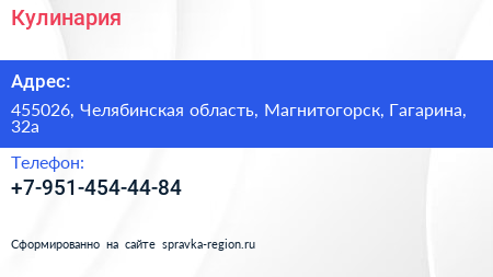Кулинария по адресу 455026, Челябинская область, Магнитогорск, Гагарина, 32а в дальнейшем Организация, размещена в следующих категориях: