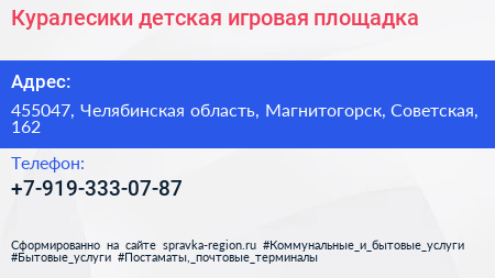 Куралесики, детская игровая площадка по адресу 455047, Челябинская область, Магнитогорск, Советская, 162 в дальнейшем Организация, размещена в следующих категориях: