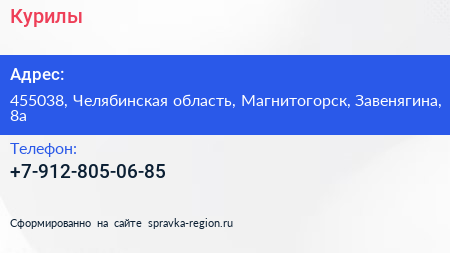 Курилы по адресу 455038, Челябинская область, Магнитогорск, Завенягина, 8а в дальнейшем Организация, размещена в следующих категориях: