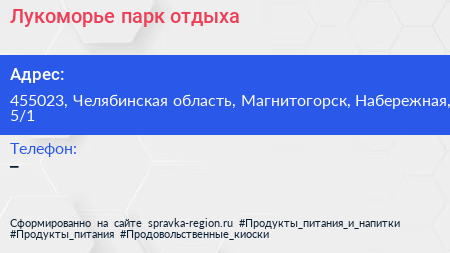 Лукоморье, парк отдыха по адресу 455023, Челябинская область, Магнитогорск, Набережная, 5/1 в дальнейшем Организация, размещена в следующих категориях: