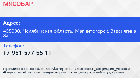 МЯСОБАР по адресу 455038, Челябинская область, Магнитогорск, Завенягина, 8а в дальнейшем Организация, размещена в следующих категориях: