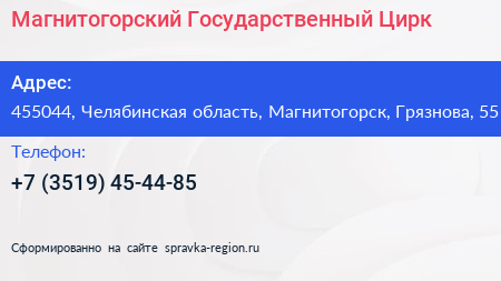 Магнитогорский Государственный Цирк по адресу 455044, Челябинская область, Магнитогорск, Грязнова, 55 в дальнейшем Организация, размещена в следующих категориях: