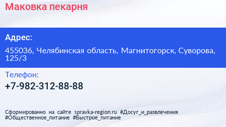 Маковка, пекарня по адресу 455036, Челябинская область, Магнитогорск, Суворова, 125/3 в дальнейшем Организация, размещена в следующих категориях: