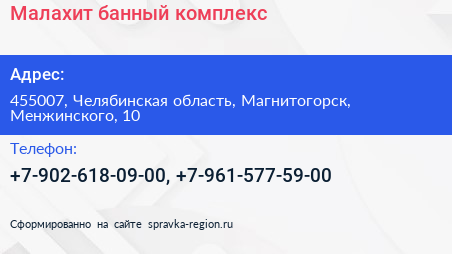 Малахит, банный комплекс по адресу 455007, Челябинская область, Магнитогорск, Менжинского, 10 в дальнейшем Организация, размещена в следующих категориях: