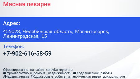 Мясная пекарня по адресу 455023, Челябинская область, Магнитогорск, Ленинградская, 15 в дальнейшем Организация, размещена в следующих категориях: