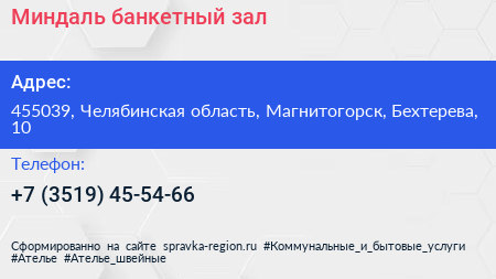 Миндаль, банкетный зал по адресу 455039, Челябинская область, Магнитогорск, Бехтерева, 10 в дальнейшем Организация, размещена в следующих категориях: