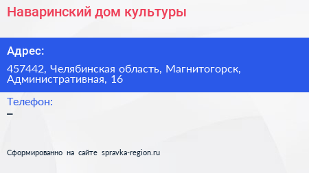 Наваринский дом культуры по адресу 457442, Челябинская область, Магнитогорск, Административная, 16 в дальнейшем Организация, размещена в следующих категориях: