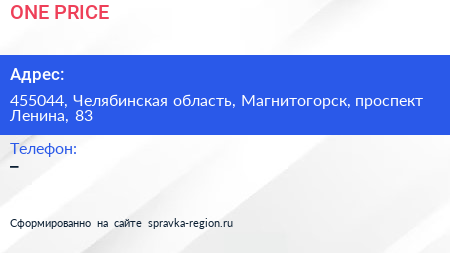 ONE PRICE по адресу 455044, Челябинская область, Магнитогорск, проспект Ленина, 83 в дальнейшем Организация, размещена в следующих категориях: