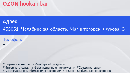OZON hookah-bar по адресу 455051, Челябинская область, Магнитогорск, Жукова, 3 в дальнейшем Организация, размещена в следующих категориях: