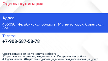 Одесса, кулинария по адресу 455030, Челябинская область, Магнитогорск, Советская, 86а в дальнейшем Организация, размещена в следующих категориях: