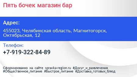 Пять бочек, магазин-бар по адресу 455023, Челябинская область, Магнитогорск, Октябрьская, 12 в дальнейшем Организация, размещена в следующих категориях: