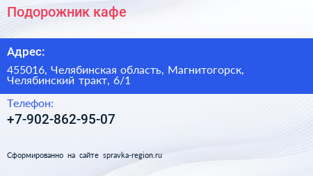 Подорожник, кафе по адресу 455016, Челябинская область, Магнитогорск, Челябинский тракт, 6/1 в дальнейшем Организация, размещена в следующих категориях: