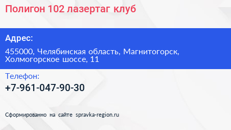 Полигон 102, лазертаг-клуб по адресу 455000, Челябинская область, Магнитогорск, Холмогорское шоссе, 11 в дальнейшем Организация, размещена в следующих категориях:
