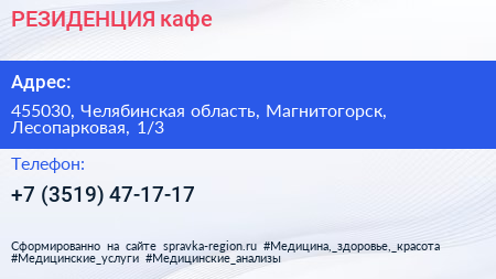 РЕЗИДЕНЦИЯ, кафе по адресу 455030, Челябинская область, Магнитогорск, Лесопарковая, 1/3 в дальнейшем Организация, размещена в следующих категориях: