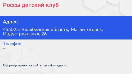 Россы, детский клуб по адресу 455025, Челябинская область, Магнитогорск, Индустриальная, 26 в дальнейшем Организация, размещена в следующих категориях:
