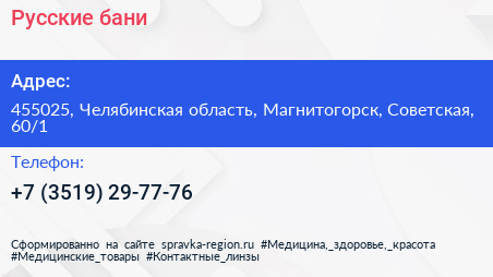Русские бани по адресу 455025, Челябинская область, Магнитогорск, Советская, 60/1 в дальнейшем Организация, размещена в следующих категориях: