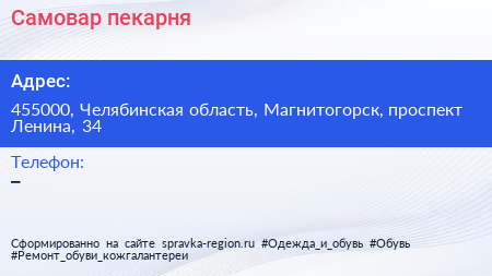 Самовар, пекарня по адресу 455000, Челябинская область, Магнитогорск, проспект Ленина, 34 в дальнейшем Организация, размещена в следующих категориях: