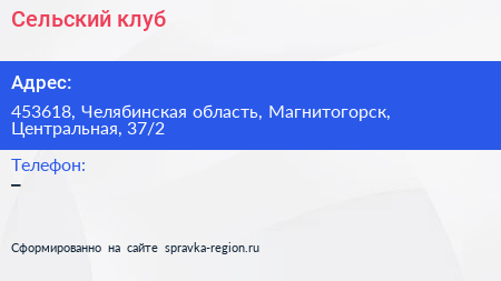 Сельский клуб по адресу 453618, Челябинская область, Магнитогорск, Центральная, 37/2 в дальнейшем Организация, размещена в следующих категориях: