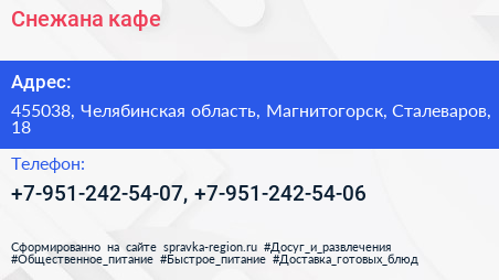 Снежана, кафе по адресу 455038, Челябинская область, Магнитогорск, Сталеваров, 18 в дальнейшем Организация, размещена в следующих категориях: