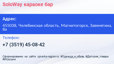 SoloWay, караоке-бар по адресу 455038, Челябинская область, Магнитогорск, Завенягина, 8а в дальнейшем Организация, размещена в следующих категориях: