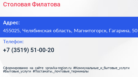 Столовая Филатова по адресу 455025, Челябинская область, Магнитогорск, Гагарина, 50 в дальнейшем Организация, размещена в следующих категориях: