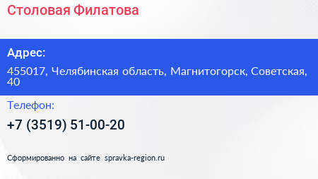 Столовая Филатова по адресу 455017, Челябинская область, Магнитогорск, Советская, 40 в дальнейшем Организация, размещена в следующих категориях: