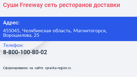 Суши Freeway, сеть ресторанов доставки по адресу 455045, Челябинская область, Магнитогорск, Ворошилова, 25 в дальнейшем Организация, размещена в следующих категориях: