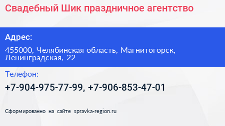 Свадебный Шик, праздничное агентство по адресу 455000, Челябинская область, Магнитогорск, Ленинградская, 22 в дальнейшем Организация, размещена в следующих категориях: