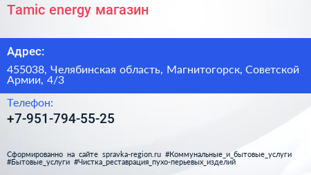 Tamic energy, магазин по адресу 455038, Челябинская область, Магнитогорск, Советской Армии, 4/3 в дальнейшем Организация, размещена в следующих категориях: