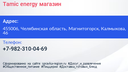 Tamic energy, магазин по адресу 455006, Челябинская область, Магнитогорск, Калмыкова, 46 в дальнейшем Организация, размещена в следующих категориях: