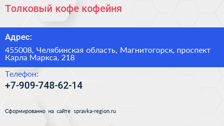 Толковый кофе, кофейня по адресу 455008, Челябинская область, Магнитогорск, проспект Карла Маркса, 218 в дальнейшем Организация, размещена в следующих категориях: