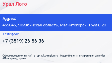 Урал Лото по адресу 455045, Челябинская область, Магнитогорск, Труда, 20 в дальнейшем Организация, размещена в следующих категориях:
