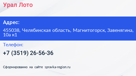 Урал Лото по адресу 455038, Челябинская область, Магнитогорск, Завенягина, 10а к1 в дальнейшем Организация, размещена в следующих категориях: