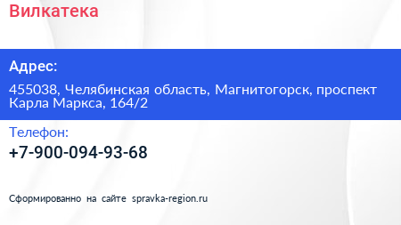 Вилкатека по адресу 455038, Челябинская область, Магнитогорск, проспект Карла Маркса, 164/2 в дальнейшем Организация, размещена в следующих категориях: