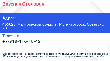 Вкусная Столовая по адресу 455025, Челябинская область, Магнитогорск, Советская, 70 в дальнейшем Организация, размещена в следующих категориях: