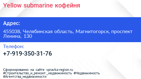 Yellow submarine, кофейня по адресу 455038, Челябинская область, Магнитогорск, проспект Ленина, 130 в дальнейшем Организация, размещена в следующих категориях: