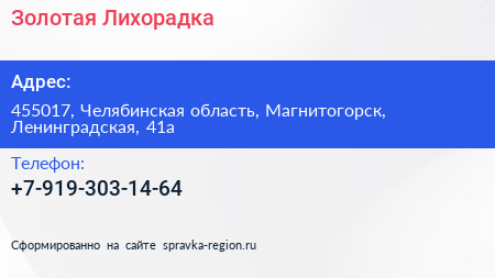 Золотая Лихорадка по адресу 455017, Челябинская область, Магнитогорск, Ленинградская, 41а в дальнейшем Организация, размещена в следующих категориях:
